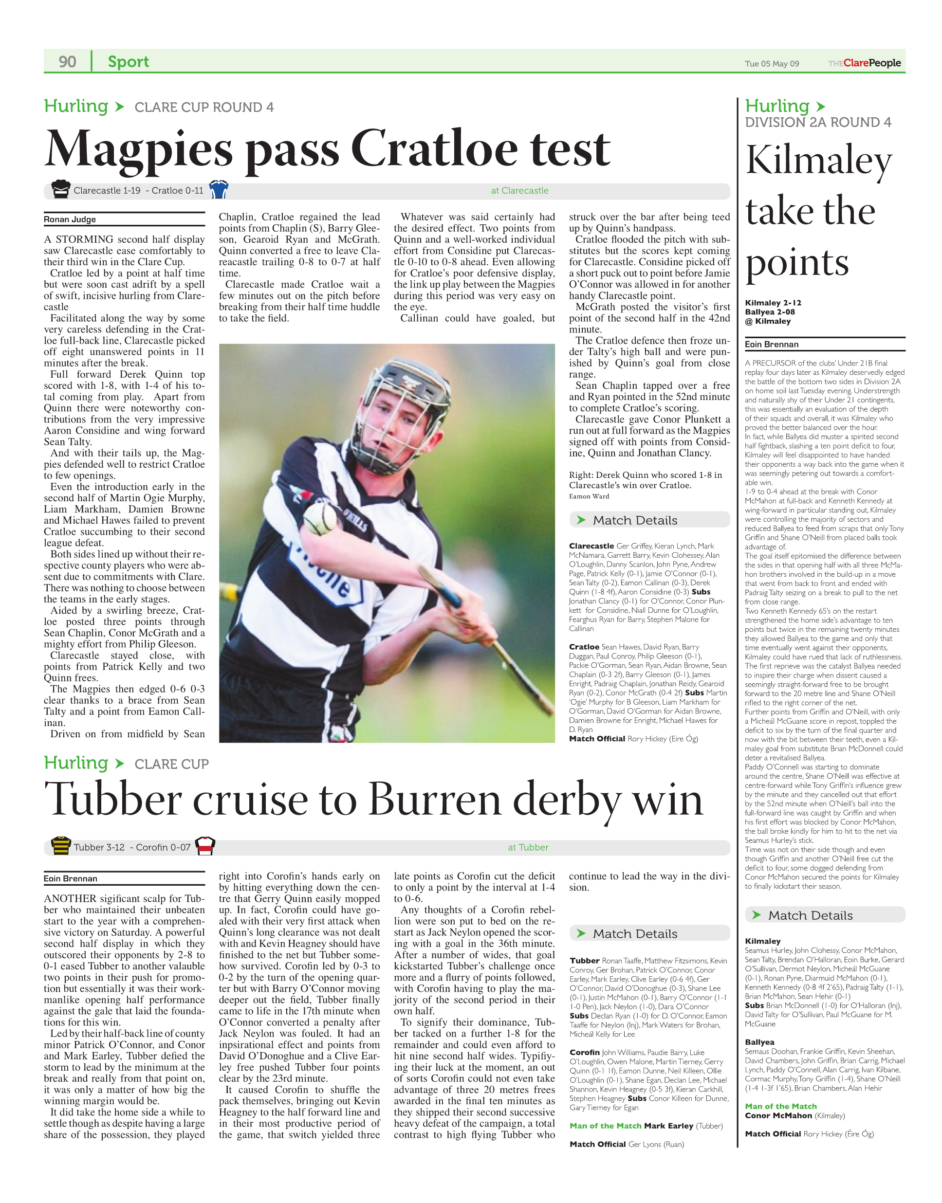right into Corofin’s hands early on by hitting everything down the cen- tre that Gerry Quinn easily mopped up. In fact, Corofin could have go- aled with their very first attack when Quinn’s long clearance was not dealt with and Kevin Heagney should have finished to the net but Tubber some- how survived. Corofin led by O-3 to Q-2 by the turn of the opening quar- ter but with Barry O’Connor moving deeper out the field, Tubber finally came to life in the 17th minute when O’Connor converted a penalty after Jack Neylon was fouled. It had an inpsirational effect and points from David O’ Donoghue and a Clive Ear- ley free pushed Tubber four points clear by the 23rd minute.