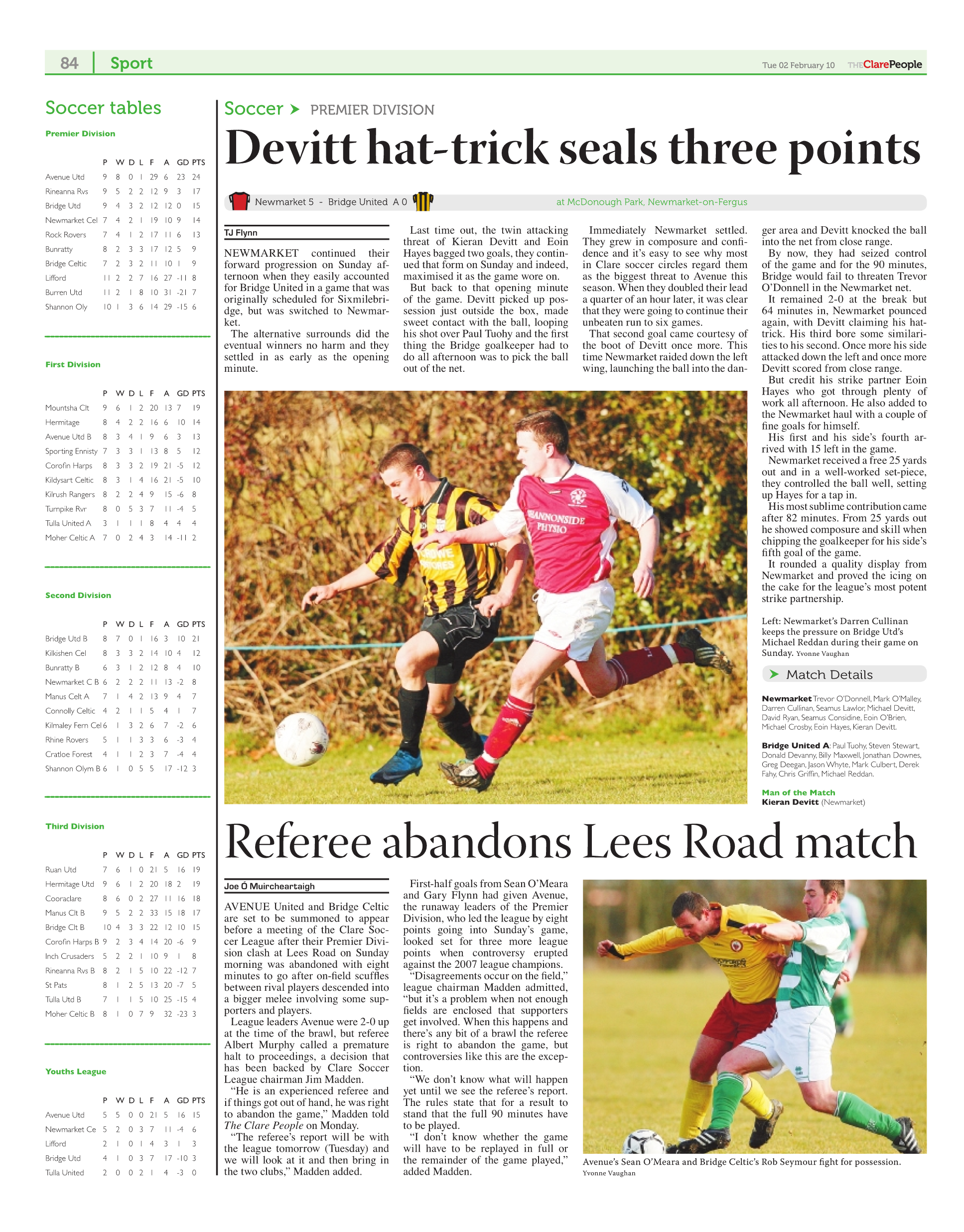 It remained 2-0 at the break but 64 minutes in, Newmarket pounced again, with Devitt claiming his hat- trick. His third bore some similari- ties to his second. Once more his side attacked down the left and once more Devitt scored from close range.