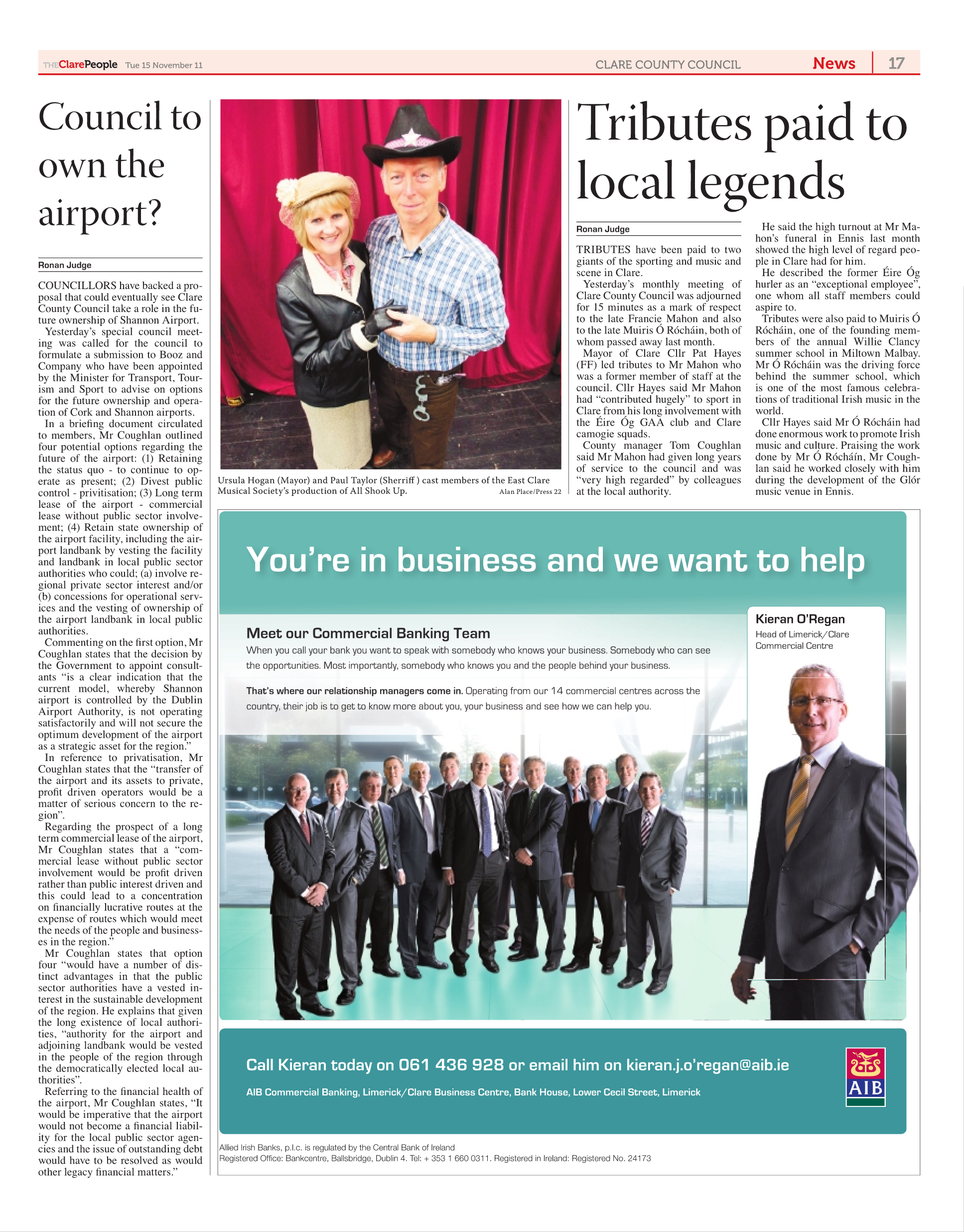 This article is from page 17 of the 2011-11-15 edition of The Clare People. OCR mistakes are to be expected so download the original SWF or the rendered page 17 JPG